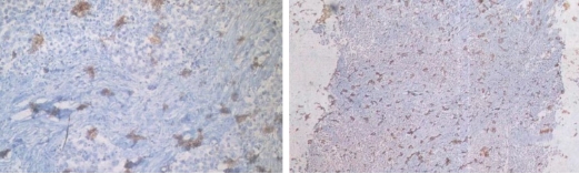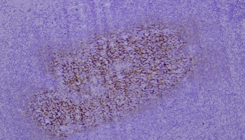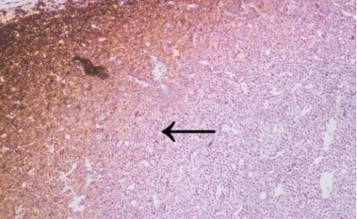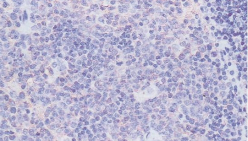 CD45 staining of paraffin-embedded human lymph node sections: Due to insufficient tissue fixation, lymphocytes at the edge of the lymph node show strong CD45 positivity, while those in the inner part of the tissue exhibit weak positivity, leading to uneven staining overall.