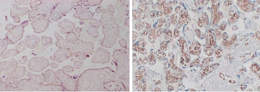 Typical Example:CD34 staining of paraffin-embedded human placental tissue sections: