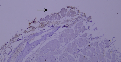 2 Staining of paraffin-embedded breast cancer tissue sections: Mammaglobin staining is positive, but section detachment occurs due to insufficient baking time.