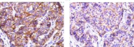Right panel: Weak membranous positivity in cancer cells, indicating insufficient staining intensity of the antibody.