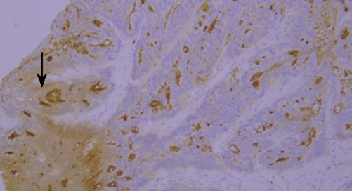Typical example: CEA staining of paraffin-embedded human colon cancer tissue sections showed accumulation of staining solution (indicated by black arrows).