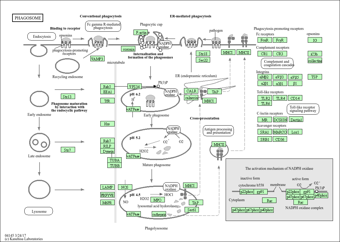 Core key proteins: Phagocytic receptors (FcγRⅠ/Ⅱ/Ⅲ, CR3/CR4, TLR4/TLR2, scavenger receptors), Actin, actin regulatory proteins (Rac1, Cdc42, Arp2/3 complex), phagocytic signal kinases (Src, Syk, PI3K), Rab GTPases (Rab5/Rab7/Rab11, regulating phagosome maturation), phagosomal membrane proteins (LAMP1/LAMP2, participating in fusion), lysosomal hydrolases (cathepsins, nucleases), TLR signal adapters (MyD88, TRIF, activating inflammatory responses), NF-κB (transcriptional regulator of inflammatory factors).