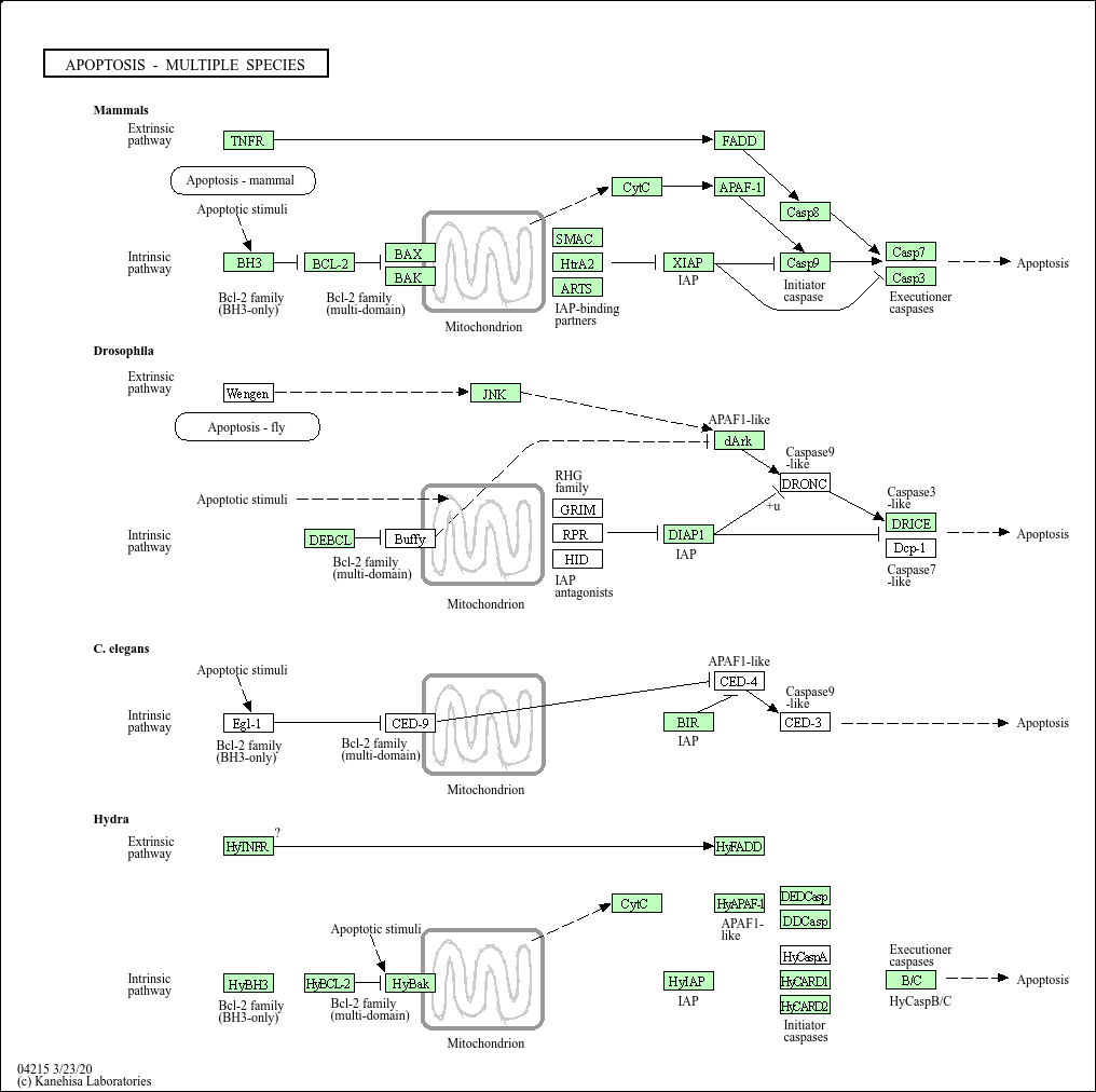 Core key proteins:C. elegans: Ced-3 (caspase homolog), Ced-4 (Apaf-1 homolog), Ced-9 (Bcl-2 homolog), Ced-1/6/7 (apoptotic cell clearance-related);Drosophila: Dronc (initiator caspase), Drice (effector caspase), Eiger (TNF homolog), Drsl (death receptor homolog);Mammals: Caspase family, Bcl-2 family, p53, IAP family (conserved core proteins).