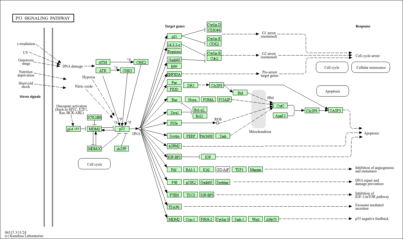1029 (CDKN2A)472 (ATM)11200 (CHEK2)545 (ATR)1111 (CHEK1)92344 (GORAB)4193 (MDM2)4194 (MDM4)7157 (TP53)10848 (PPP1R13L)1026 (CDKN1A)2810 (SFN)56475 (RPRM)10912 (GADD45G), 1647 (GADD45A), 4616 (GADD45B)51512 (GTSE1)25946 (ZNF385A)355 (FAS)55367 (PIDD1)581 (BAX)10572 (SIVA1)9538 (EI24), 9540 (TP53I3)51246 (SHISA5)84883 (AIFM2)3486 (IGFBP3)5054 (SERPINE1)1643 (DDB2)5728 (PTEN)55240 (STEAP3)4193 (MDM2)595 (CCND1), 894 (CCND2), 896 (CCND3)1019 (CDK4), 1021 (CDK6)898 (CCNE1), 9134 (CCNE2)1017 (CDK2)891 (CCNB1), 9133 (CCNB2)983 (CDK1)8795 (TNFRSF10B), 8797 (TNFRSF10A)841 (CASP8)637 (BID)5366 (PMAIP1)27113 (BBC3)63970 (TP53AIP1)598 (BCL2L1)596 (BCL2)64065 (PERP)64393 (ZMAT3)6477 (SIAH1)3479 (IGF1)575 (ADGRB1)3732 (CD82)7057 (THBS1)5268 (SERPINB5)50484 (RRM2B), 6241 (RRM2)10912 (GADD45G), 1647 (GADD45A), 4616 (GADD45B)143686 (SESN3), 27244 (SESN1), 83667 (SESN2)7249 (TSC2)3486 (IGFBP3)64326 (COP1)25898 (RCHY1)900 (CCNG1), 901 (CCNG2)6477 (SIAH1)8493 (PPM1D)7161 (TP73)54205 (CYCS)317 (APAF1)842 (CASP9)836 (CASP3)