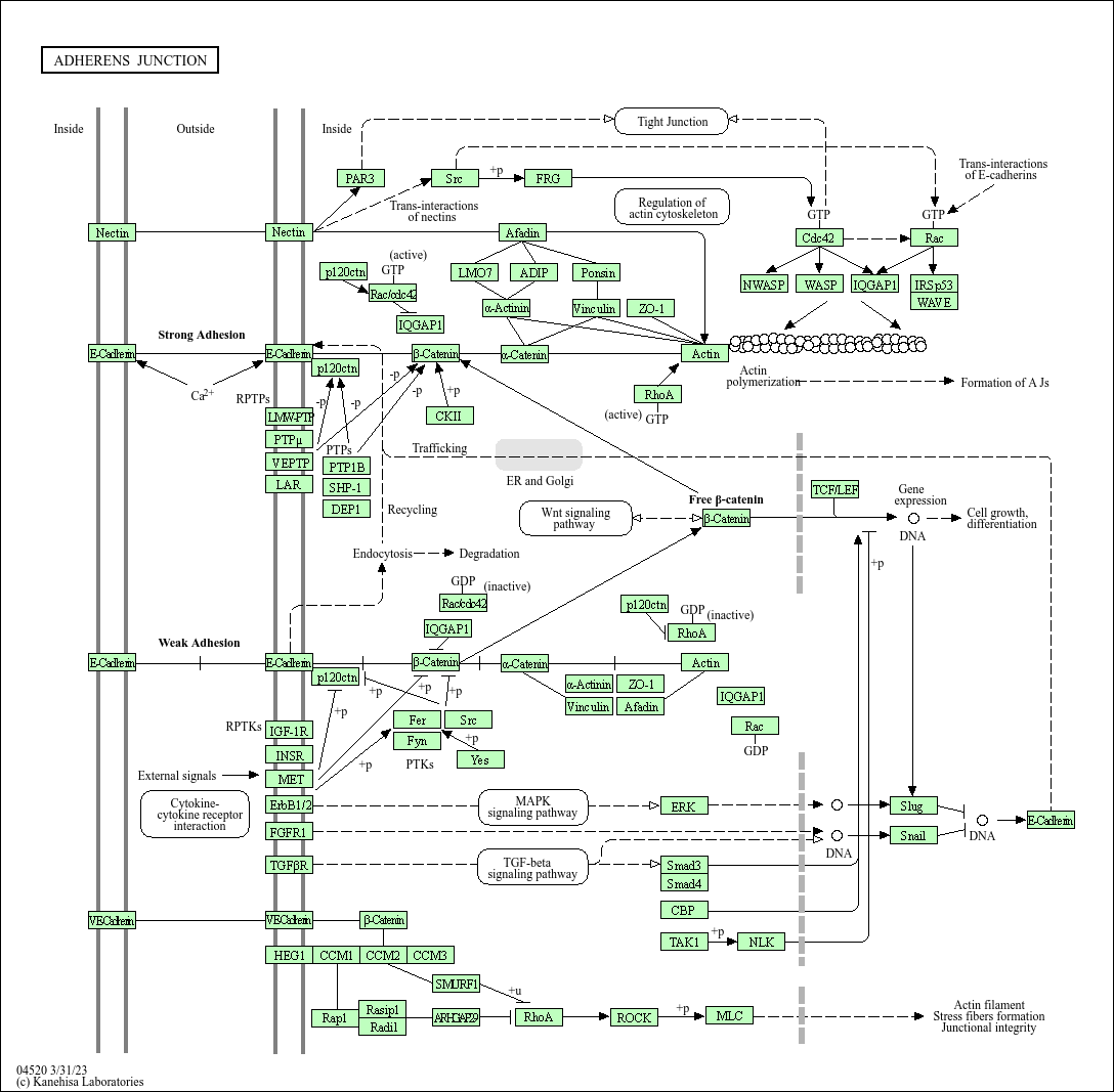 Core of basic research: Focuses on the molecular mechanism by which adherens junctions mediate stable intercellular adhesion and transmit mechanical signals, critical for maintaining tissue integrity and morphogenesis. The core structure is the Cadherin-Catenin complex: Classical cadherins (E-, N-, P-Cadherin) bind adjacent cells via calcium-dependent homophilic interactions in their extracellular domains; their intracellular domains associate with β-Catenin and α-Catenin, further linking to the actin cytoskeleton to form continuous intercellular adhesion belts. This pathway not only maintains cell arrangement but also participates in Wnt signaling via β-Catenin, regulating cell proliferation and differentiation. Research focuses include the expression specificity of cadherins, phosphorylation regulation of catenins, dynamic associations between adherens junctions and the cytoskeleton, and the association of pathway abnormalities with tumor invasion (e.g., downregulated E-Cadherin causing cell detachment) and developmental malformations.
