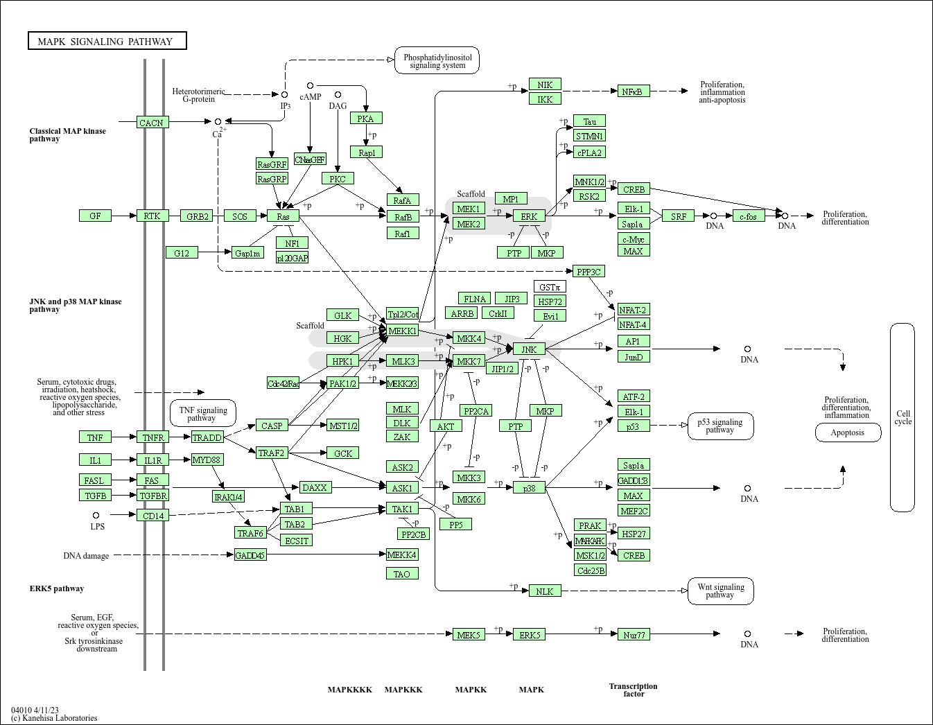 A key intracellular signal transduction network that transmits various extracellular signals, including growth factors, cytokines, and stress stimuli (e.g., oxidative stress, ultraviolet radiation), through a three-tier kinase cascade (MAPKKK→MAPKK→MAPK). There are four main branches in mammals: ERK1/2 (regulating proliferation and differentiation), JNK (regulating apoptosis and inflammation), p38 (regulating stress response and differentiation), and ERK5 (regulating angiogenesis and cell survival). For example, growth factors activate the ERK1/2 pathway to promote cell proliferation; oxidative stress activates the JNK and p38 pathways to induce cell apoptosis or initiate stress adaptation. The pathway participates in multiple physiological processes such as embryonic development, immune response, and tissue repair. Abnormal activation is associated with tumors, inflammatory diseases, and neurodegenerative diseases, and inhibitors targeting MEK and ERK have been used in tumor treatment.