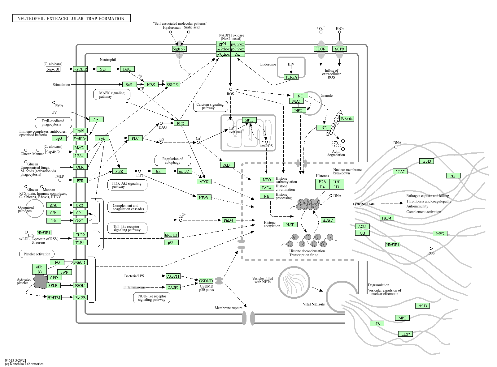 Core of basic research: It focuses on the mechanism by which neutrophils release neutrophil extracellular traps (NETs) to capture and kill pathogens upon infection or inflammatory stimulation, an important anti-infective method of neutrophils. NETs consist of decondensed chromatin DNA, histones, and granular proteins (e.g., myeloperoxidase, elastase). After neutrophils are activated by stimulating signals (e.g., bacteria, cytokines, immune complexes), ROS production increases, activating PEPAD4 to citrullinate histones, leading to chromatin decondensation and extracellular release to form a network structure. NETs can capture pathogens such as bacteria, fungi, and viruses, and kill them through the enzymatic activity of granular proteins and the cationic properties of DNA. However, excessive NET formation can also damage surrounding tissues. Research focuses include the signal pathways of NET formation (e.g., PI3K-Akt, MAPK), regulation of histone citrullination, association between NETs and thrombosis, and mechanisms of excessive NET accumulation in pathological states (e.g., sepsis, autoimmune diseases).