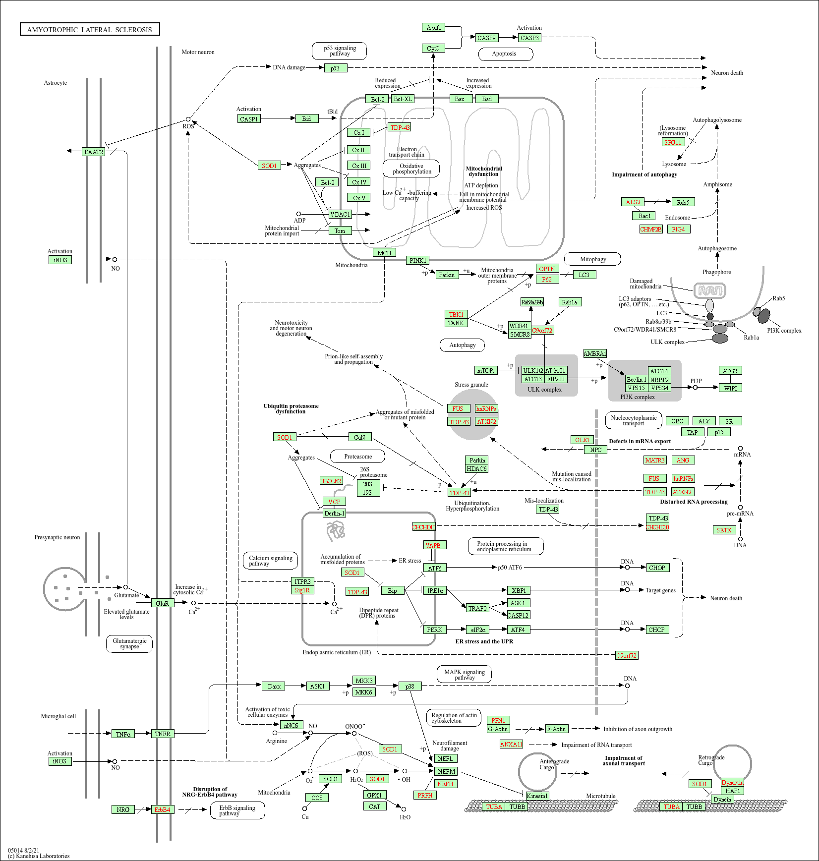 Core key proteins: SOD1 (superoxide dismutase 1, mutation causes oxidative stress), TDP-43/FUS (RNA-binding proteins with abnormal aggregation upon mutation), C9orf72 (gene amplification causes neuronal damage), ALS2/OPTN (autophagy-related proteins with functional abnormalities), p62/LC3 (autophagy markers reflecting autophagic function).