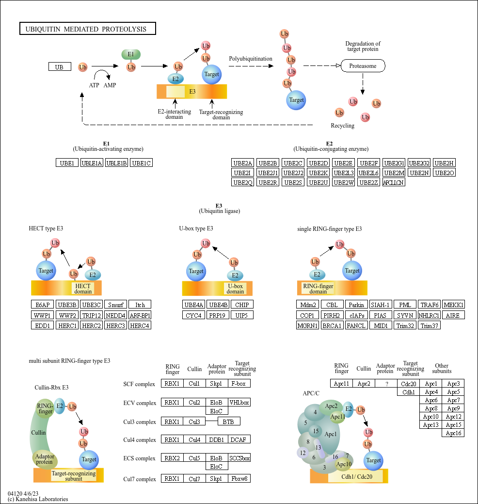 Core key proteins: Ubiquitin, E1 ubiquitin-activating enzyme (UBE1), E2 ubiquitin-conjugating enzymes (UBE2 family), E3 ubiquitin ligases (RING-type: MDM2, SCF complex; HECT-type: E6AP; RBR-type: Parkin), deubiquitinating enzymes (DUB family: USP, UCH, OTU subfamilies), proteasome (degrades polyubiquitinated proteins), target proteins (cyclins, transcription factors, oncoproteins, etc.), SCF complex (subunits Skp1, Cullin1, F-box protein).