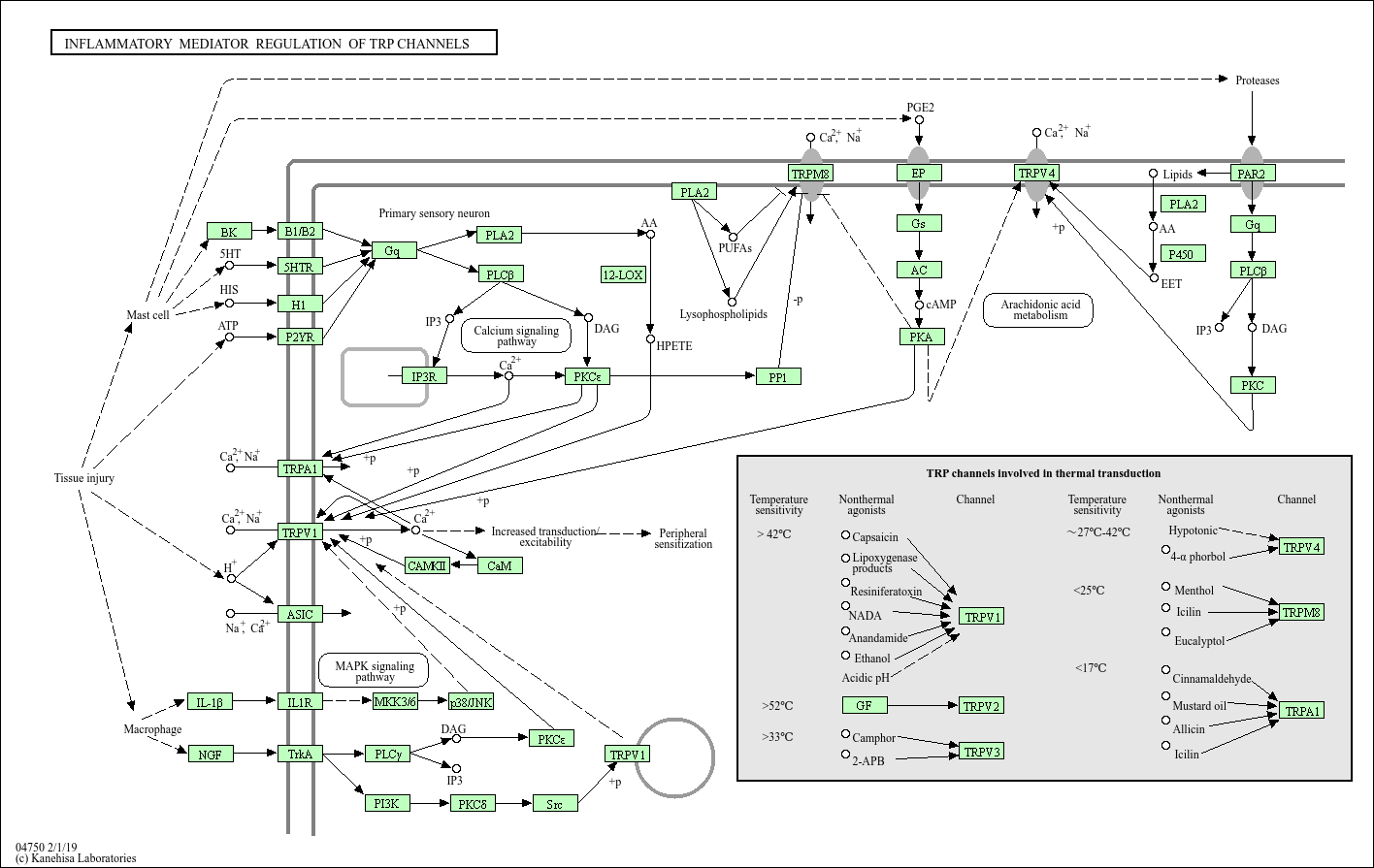 Core of basic research: Clarifies mechanisms by which inflammatory mediators regulate TRP (transient receptor potential) channel activity. TRP channels, as ion channels, participate in pain, temperature sensing, ion homeostasis, and inflammation. Inflammatory mediators (histamine, prostaglandins, capsaicin, oxidative stress products) regulate TRPs in two ways: direct binding (e.g., capsaicin to TRPV1) or indirect sensitization/activation via GPCR-mediated pathways (e.g., histamine-H1 receptor-PLC-γ-TRPV1 phosphorylation). Channel activation induces calcium influx, activating MAPK/NF-κB pathways to secrete IL-6/TNF-α, amplifying inflammation and pain. Research focuses on mediator-TRP interaction specificity, phosphorylation regulation, functional differences among TRP subtypes (TRPV1, TRPA1, TRPM8), and pathway abnormalities in inflammatory pain (arthritis, neuropathic pain) and allergic diseases (asthma, urticaria).