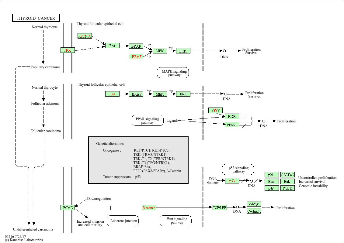 Core of basic research: Focus on the abnormal activation of the MAPK pathway (BRAF V600E, RET/PTC fusion, RAS), explore the expression regulation of iodine metabolism-related genes (TTF-1, Pax8), and the molecular characteristic differences among subtypes (papillary carcinoma, follicular carcinoma, medullary carcinoma, anaplastic carcinoma).